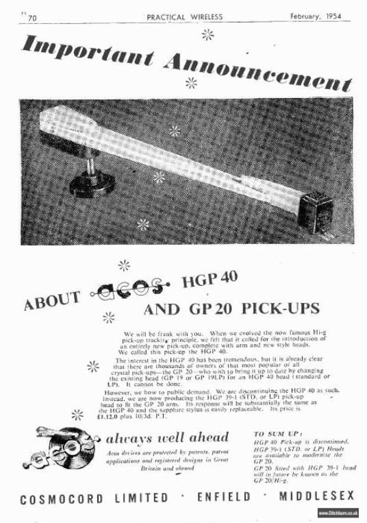 The Ditchburn MK2R Music Maker used the acos GP-20 style of Tonearm and HGP 39-1 LP Crystal Pickup